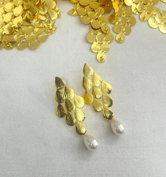 Golden Textured Raw Stone Cluster Pearl Drop Earring