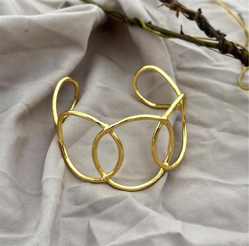 This bold and modern cuff bracelet is a wearable work of art. The design features a continuous flow of interlocking, open ovals that create a striking abstract pattern. Crafted with a polished gold-toned finish, the bracelet catches the light beautifully, adding a touch of contemporary elegance to any outfit. The open cuff style makes it easy to slide on and off, while the wide, sculptural shape makes a powerful statement on its own. It's the perfect accessory for someone who loves clean lines and unique, artistic jewelry.