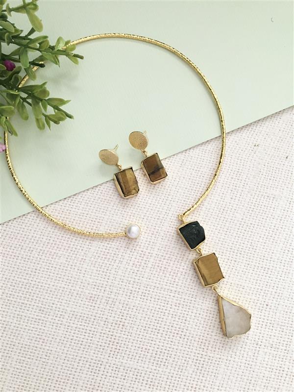 Elevate your look with our artistic Asymmetrical Raw Stone Choker Set. This stunning set features a unique open-collar necklace with a single, elegant pearl on one end and a dramatic drop of three linked raw stones on the other. The stones, with their distinct, natural shapes and varied colors, create a captivating focal point. The set is completed with a pair of matching stud earrings, featuring a small hammered disk and a single raw stone. The gold-toned finish unites the entire design, making this set a true statement piece for any occasion.