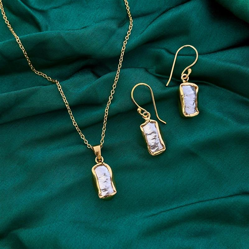 Elevate your style with the Aurora Baroque Pearl Set, a graceful blend of modern elegance and timeless charm. This set features a minimalist gold-tone chain with a natural baroque pearl pendant, paired with matching drop earrings.