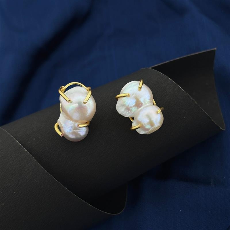 These captivating earrings are a modern twist on a timeless classic. Each piece showcases two organically shaped baroque pearls held in place by a minimalist, gold-toned claw setting. The natural, irregular forms of the pearls give each earring a unique and artistic character, ensuring no two pairs are exactly alike. The rich luster of the pearls against the simple metalwork creates a striking and sophisticated look.