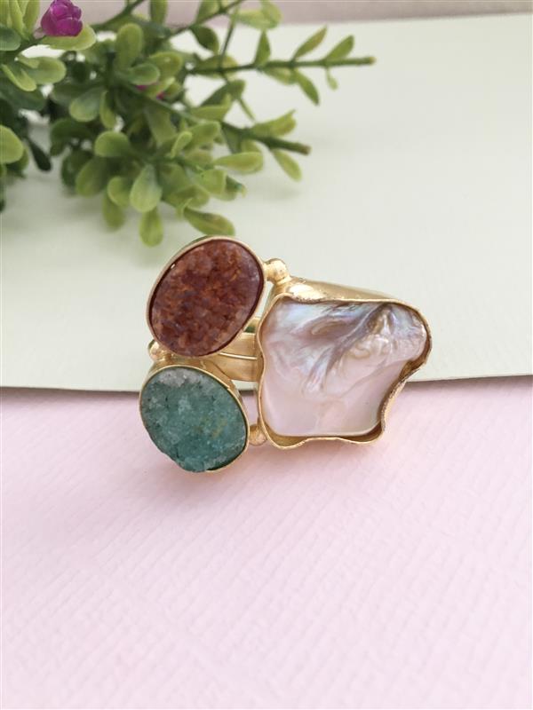 A perfect blend of elegance and raw beauty, this ring features a lustrous Mother of Pearl paired with a natural rough stone. The adjustable band ensures a comfortable fit, while the unique textures make it a standout accessory for any occasion.