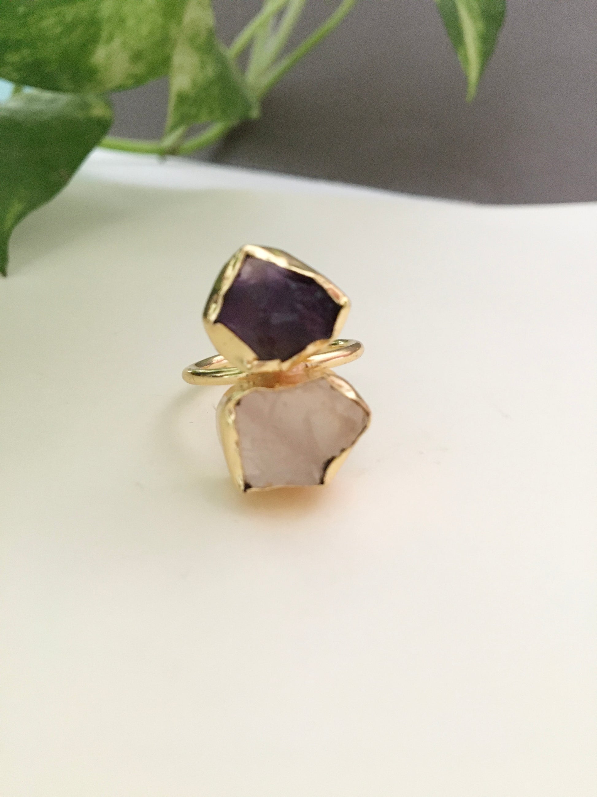 Add a bold touch of nature to your style with our Dual Rough Stone Finger Ring. This eye-catching piece features two raw, uncut stones set on an adjustable open band — each stone showcasing its natural texture and beauty.