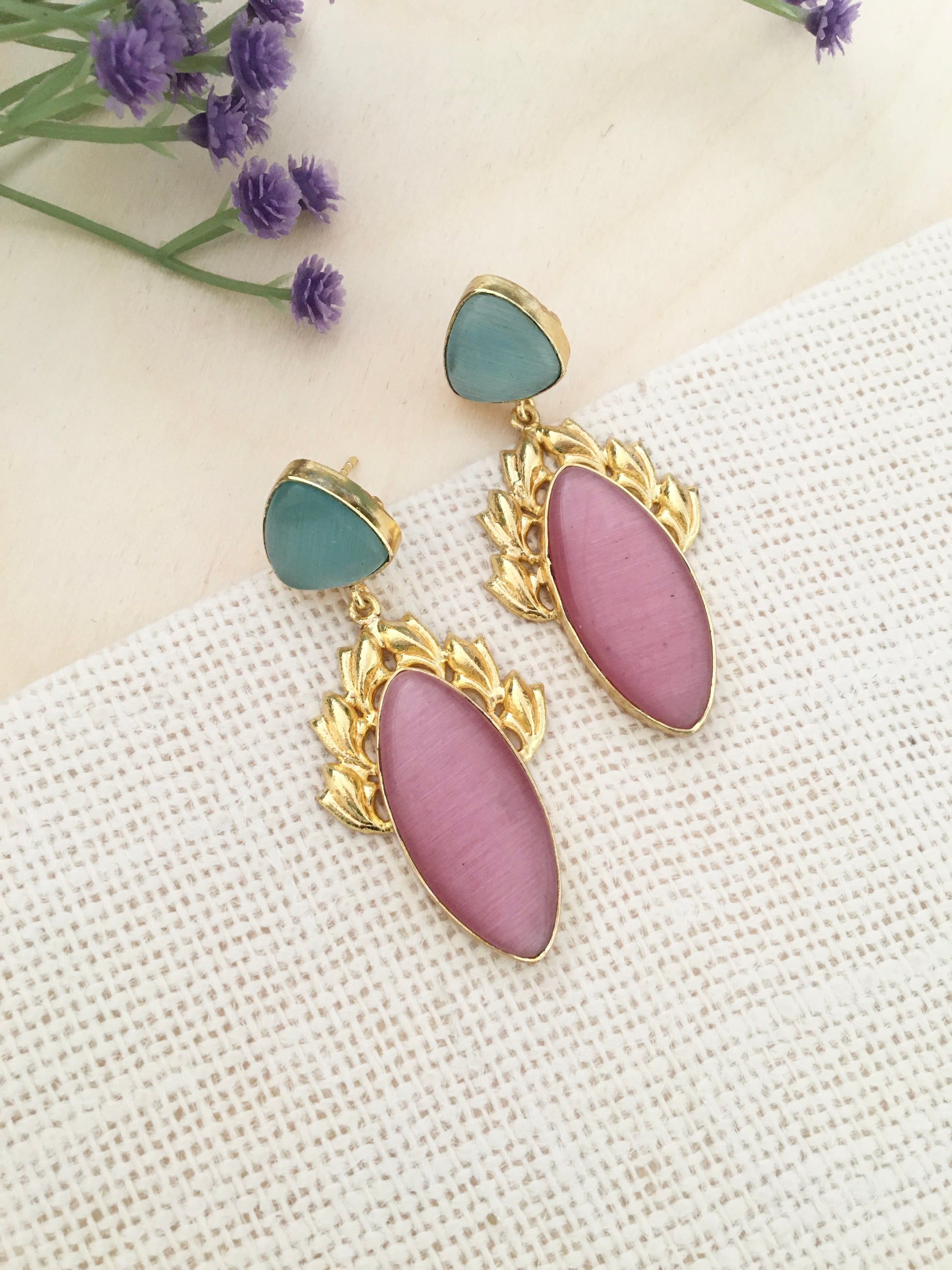 A chic fusion of soft aqua and rose hues, these statement earrings add a touch of elegance to any ensemble. Designed with glossy stone finishes and framed in golden leaf detailing, they offer a graceful balance of modern charm and timeless sophistication. Perfect for brunch outings, festive wear, or stylish evening events, these earrings instantly elevate your look with subtle luxury.