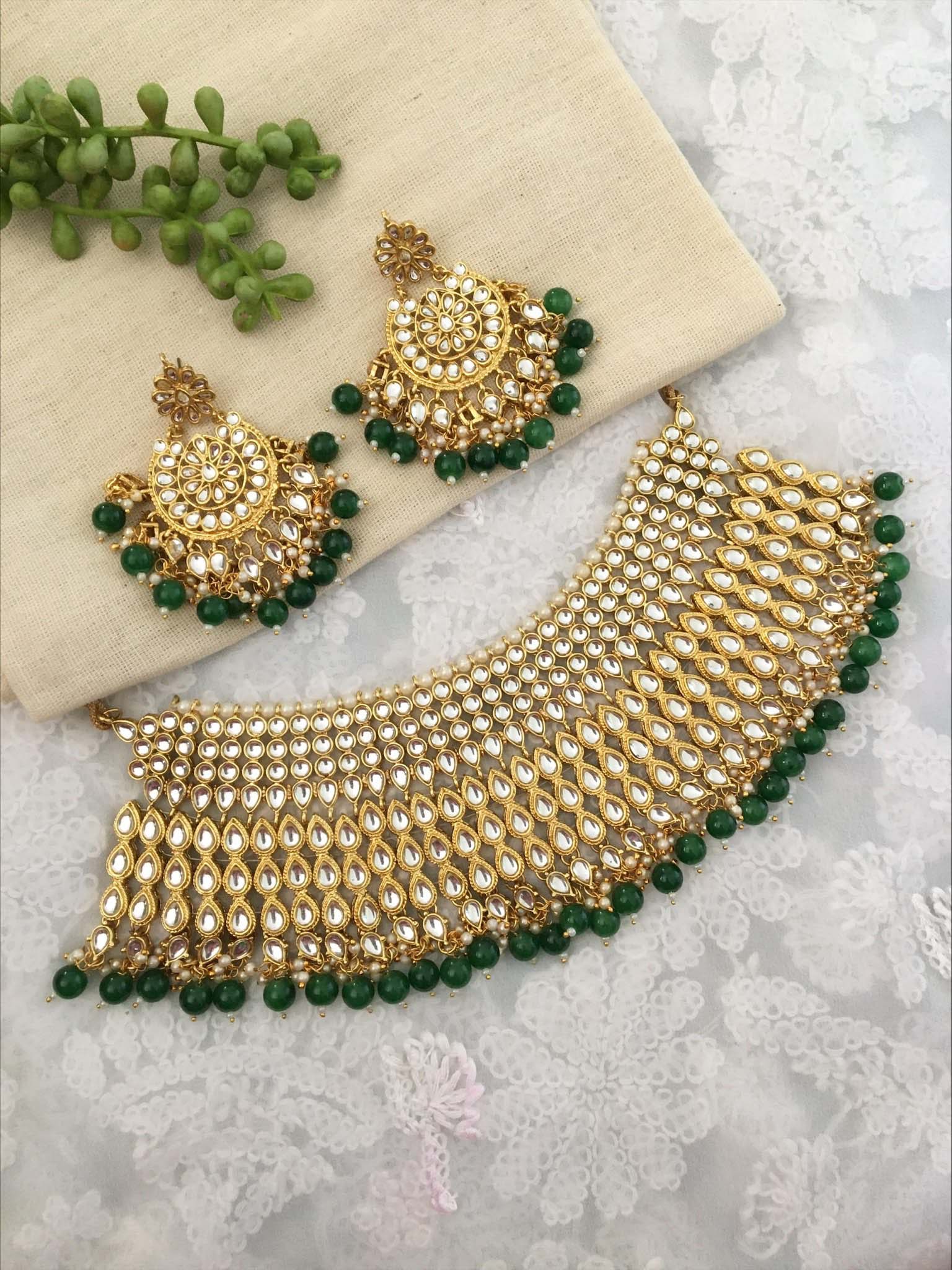 This Necklace Set has an ethnic designer pattern. It appear elegant and add up richness to the overall look. This can go well with any ethnic wear. It will instantly glow up your appearance. They have a perfect collection of modern work with stones, pearls and beads. Look radiant by putting on this set on your coming special day. You will adore them.