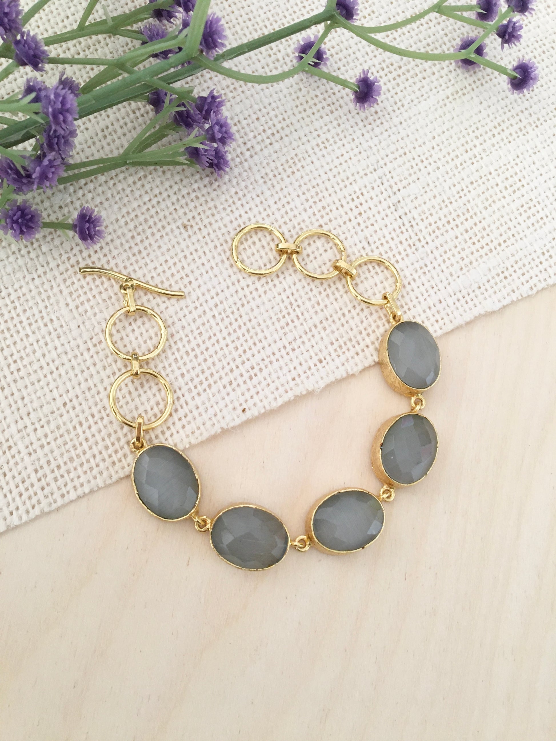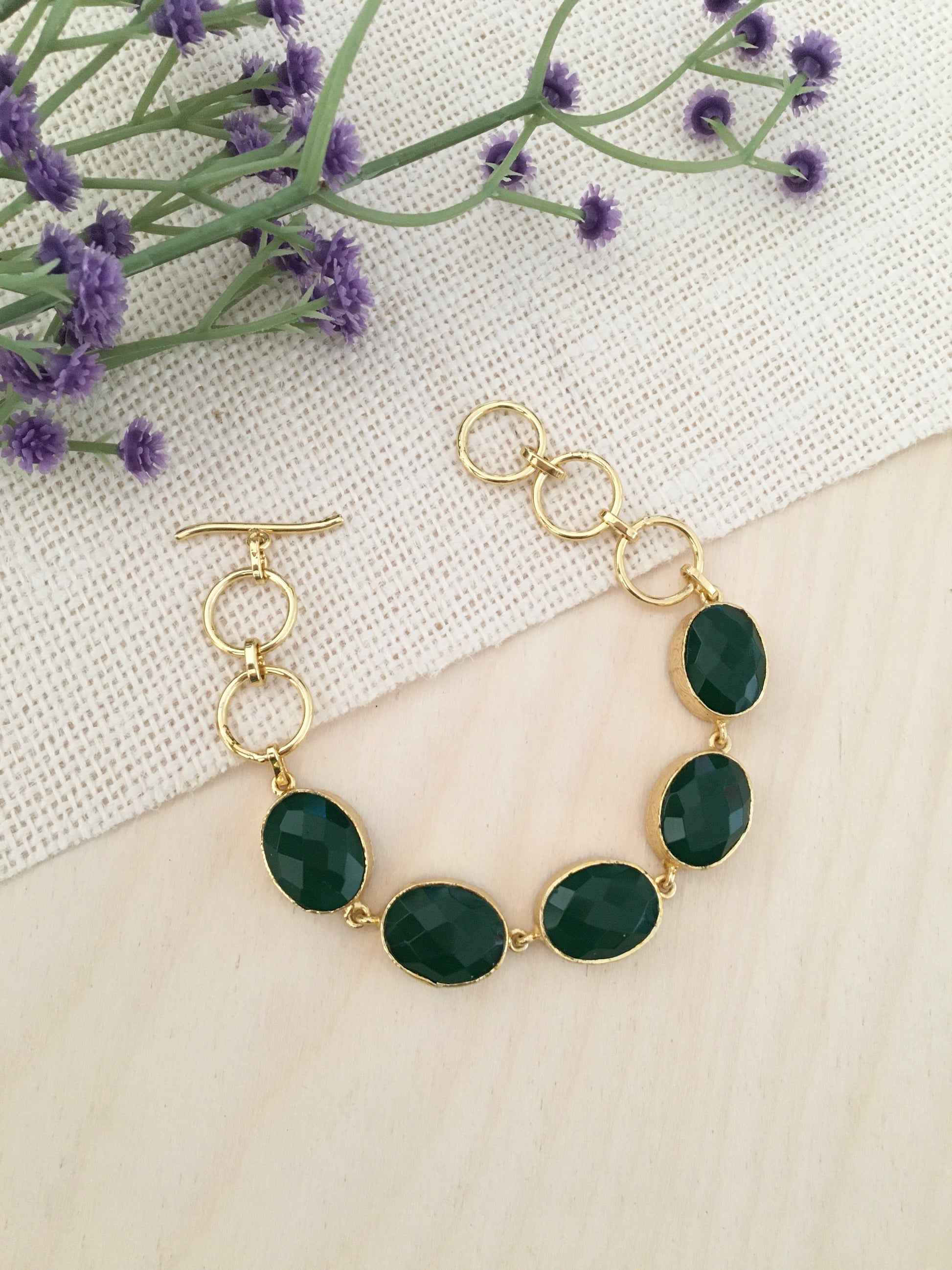 A striking handcrafted bracelet featuring rich red faceted oval stones set in a sleek gold-plated frame. Its elegant link design and toggle clasp add a refined touch, making it perfect for festive occasions, parties, and everyday chic styling.