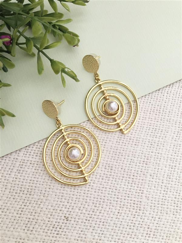 Elevate your look with the Garima Double Circle Pearl Drop Earrings, featuring a modern layered design. Crafted with concentric gold-toned circles and accented with a lustrous pearl at the center, these lightweight earrings add sophistication and charm to any outfit. Perfect for both everyday elegance and special occasions.