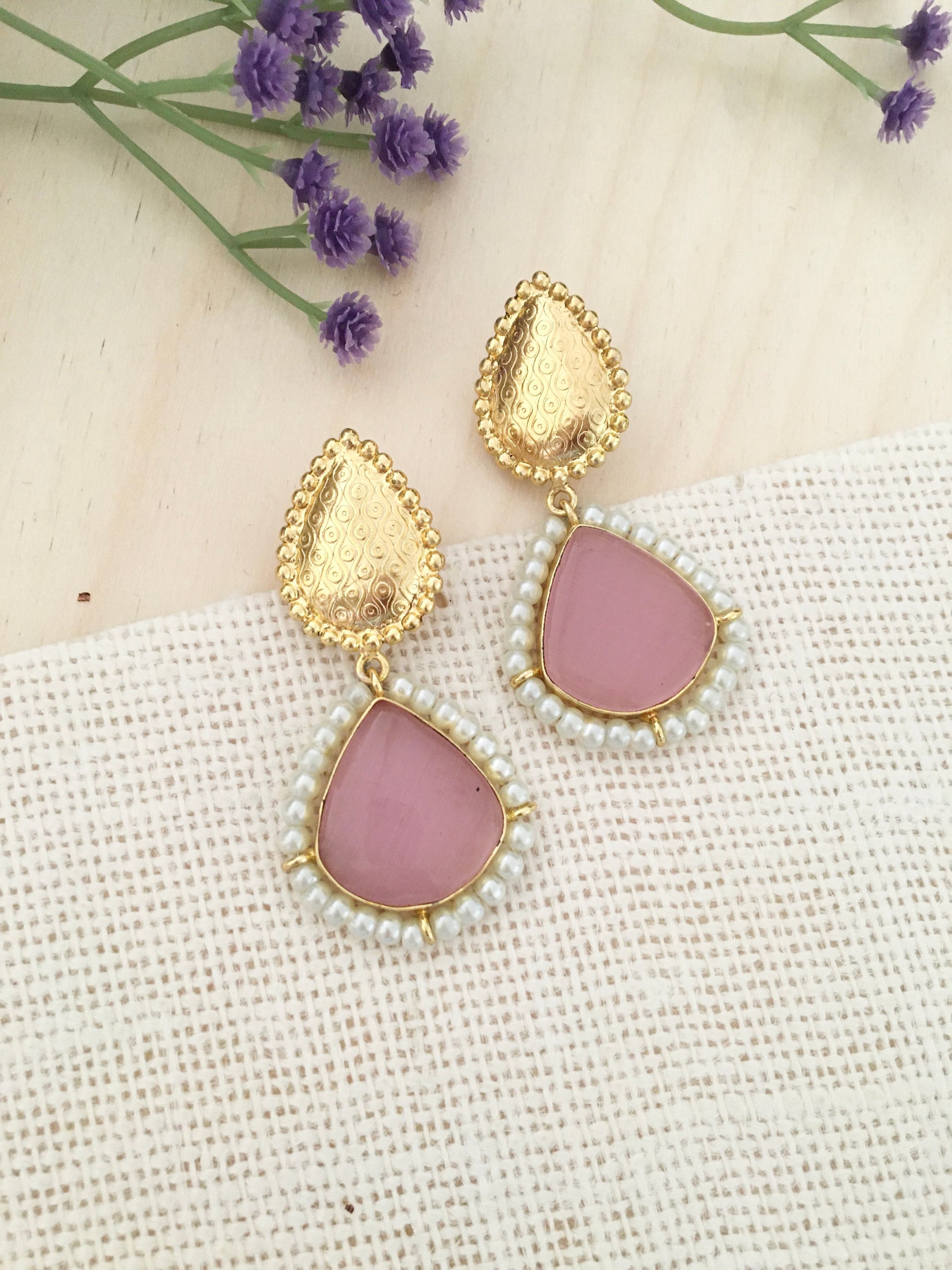 These stunning handcrafted earrings feature a unique teardrop design with embossed golden metal paired beautifully with amber-toned stones framed in delicate pearl accents. Elegant, graceful, and timeless, they add a touch of luxury to both traditional and contemporary outfits. Perfect for festive occasions, weddings, parties, or elevating your everyday ethnic style.