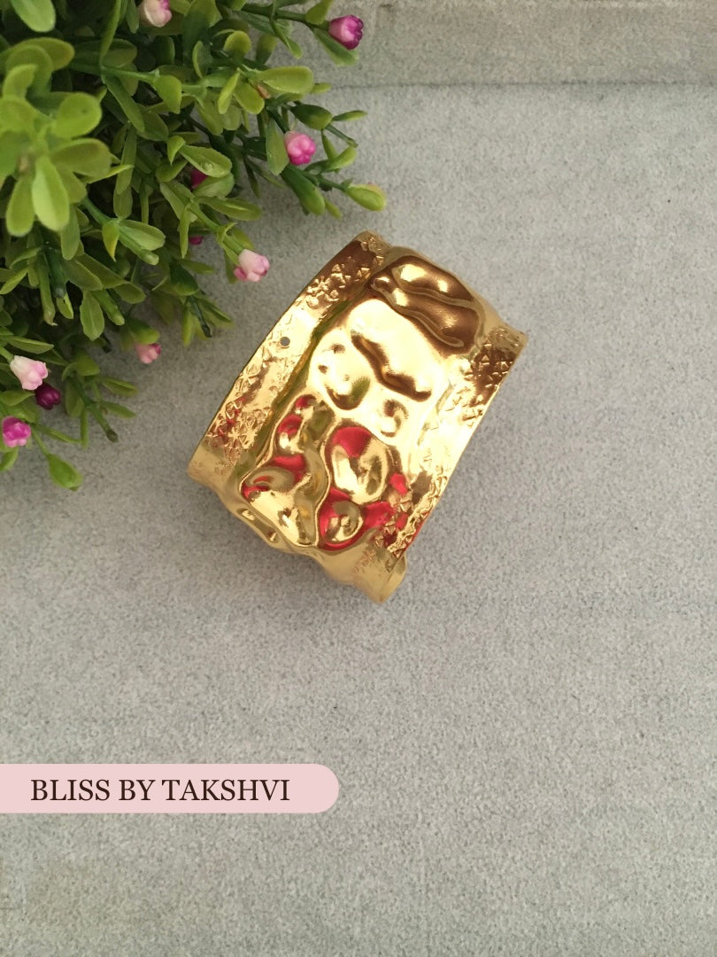 A golden textured brass hammered cuff bracelet is a stylish and versatile piece of jewelry. It's typically made of brass with a hammered finish that adds a unique texture, reflecting light beautifully. The golden hue gives it a warm, elegant look, making it a perfect accessory for both casual and formal outfits.