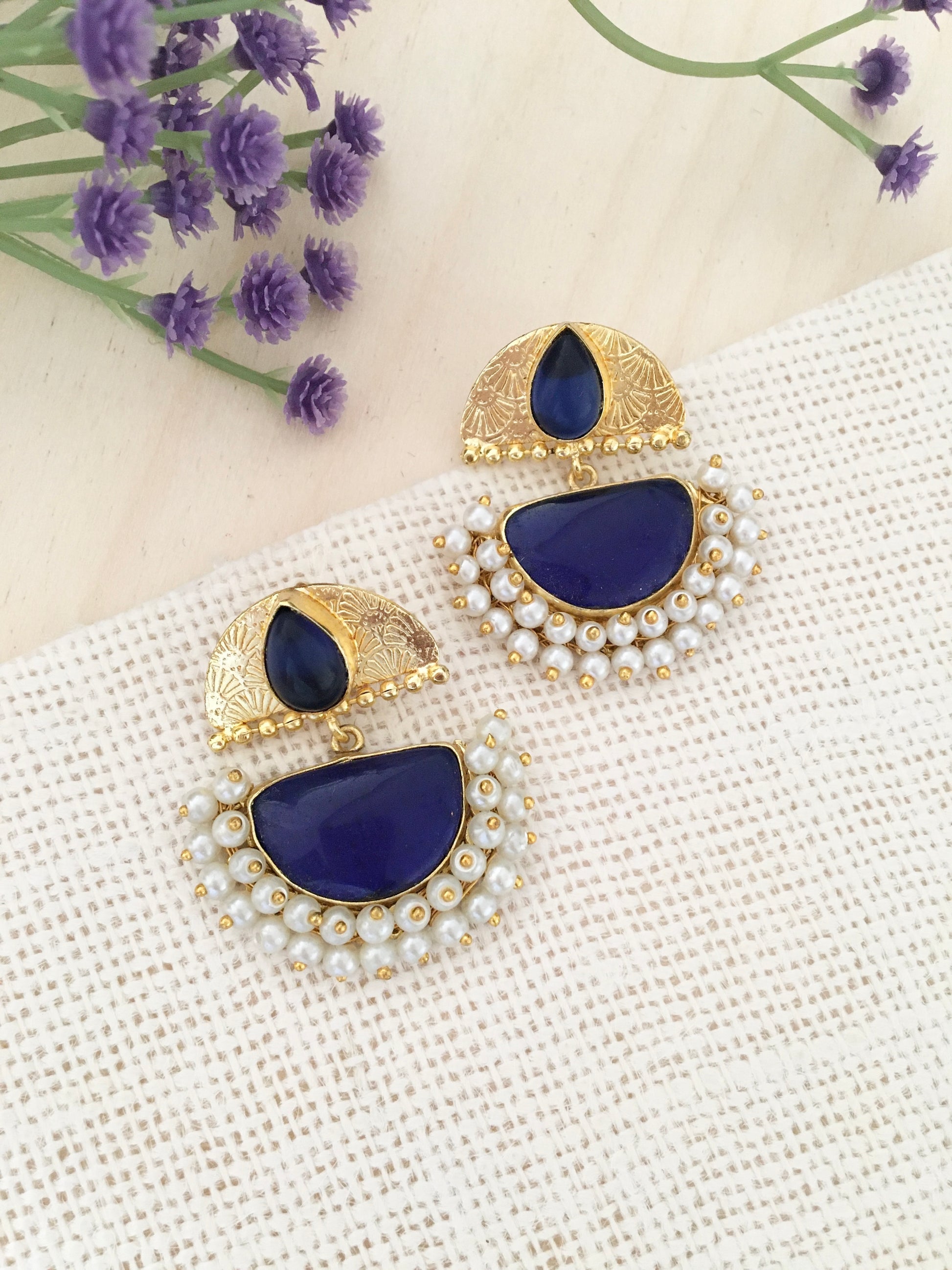 Elevate your traditional look with these stunning ruby-toned half-moon earrings, crafted with intricate golden detailing and finished with a beautiful border of dainty pearls. The bold red stones add a luxurious pop of color, making them perfect for festive occasions, weddings, and ethnic celebrations. A blend of elegance and heritage, these earrings are designed to stand out with grace.