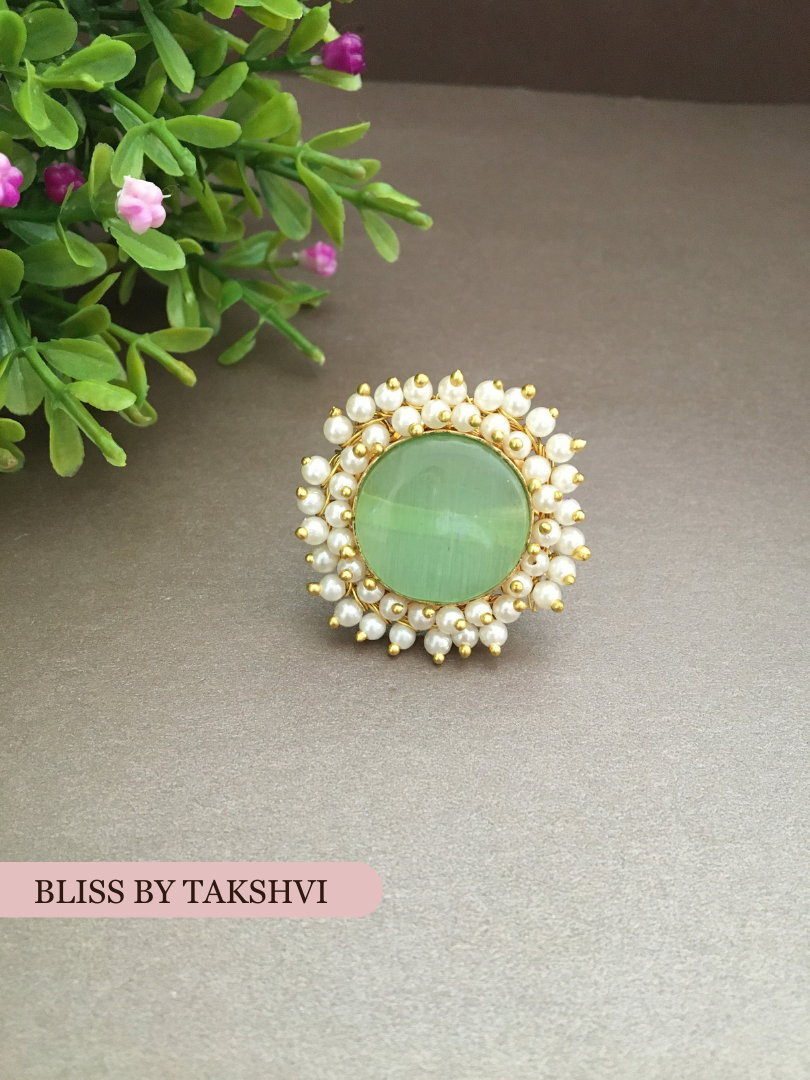 Design Style: Adjustable finger ring featuring a stone cluster surrounding a pearl centerpiece