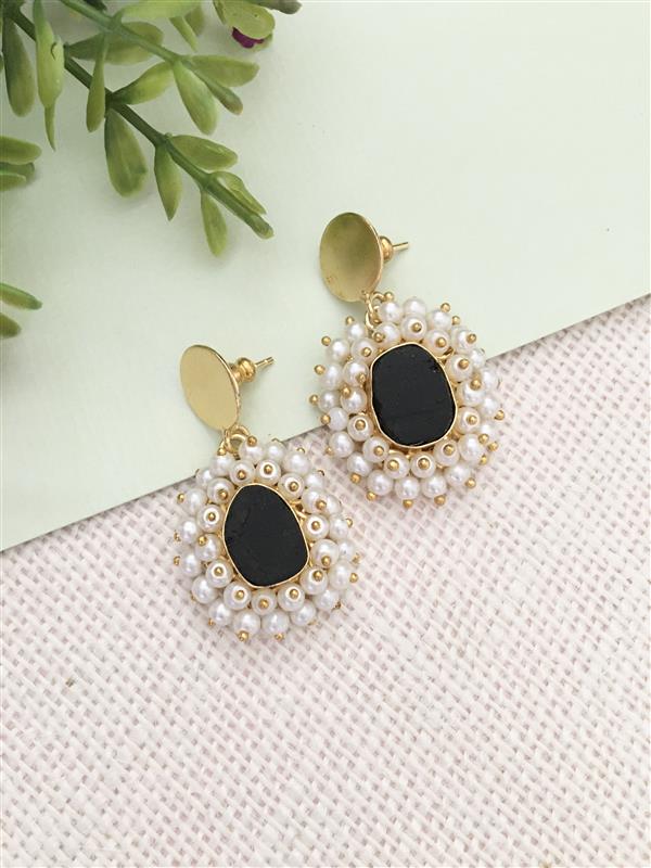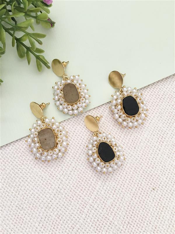 Elevate your accessory game with our Lattice Pearl Drop Earrings, a perfect blend of modern design and timeless elegance. Each earring features a beautifully framed central gemstone, either a sleek black or a muted stone, surrounded by a delicate lattice of lustrous tiny pearls. The small gold-toned beads sprinkled throughout the design add a touch of subtle sparkle, while the oval top stud provides a clean, polished finish.