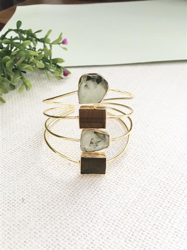 Design Style: Tiered cuff bracelet featuring a mix of raw and geometric stones