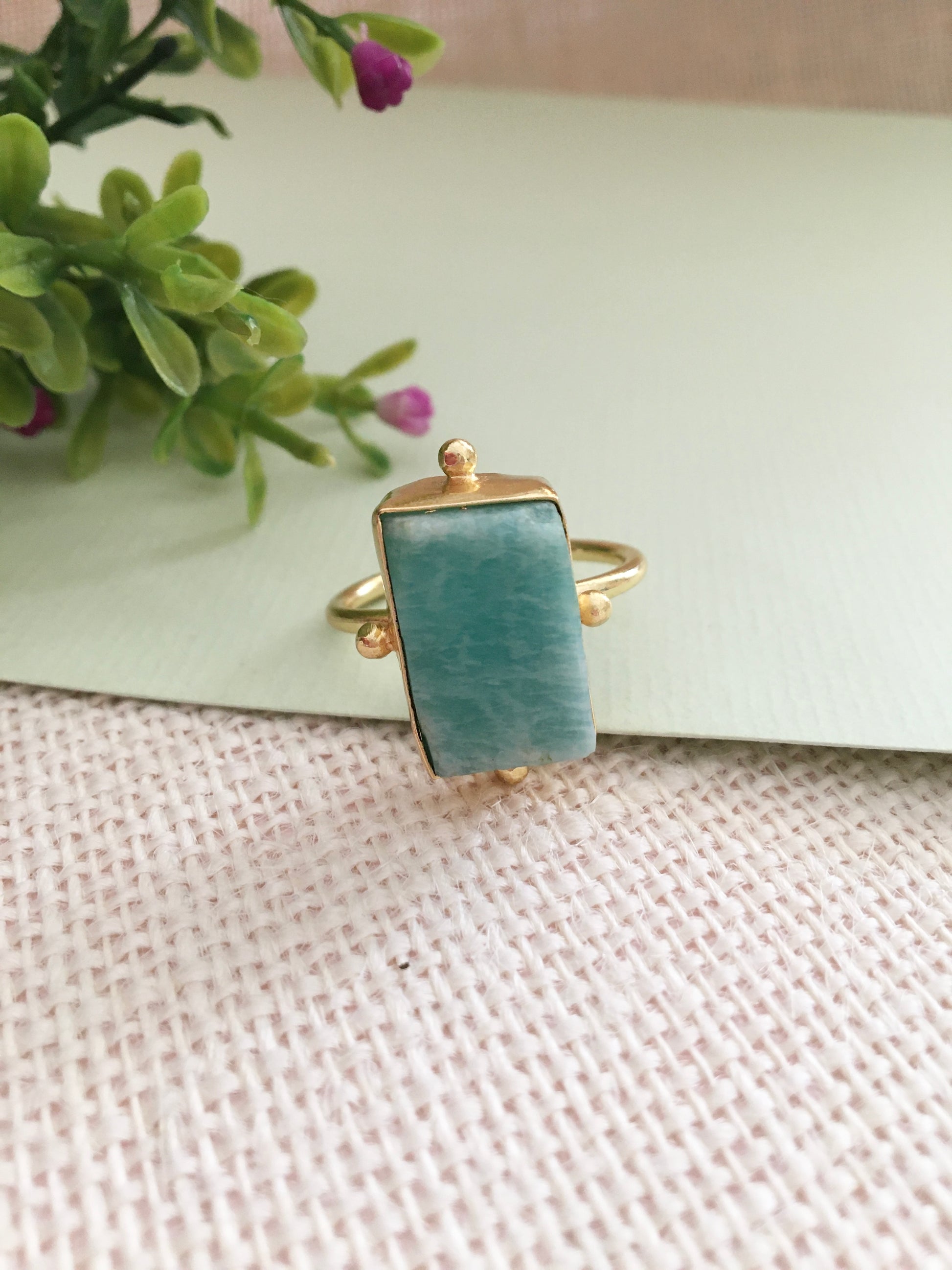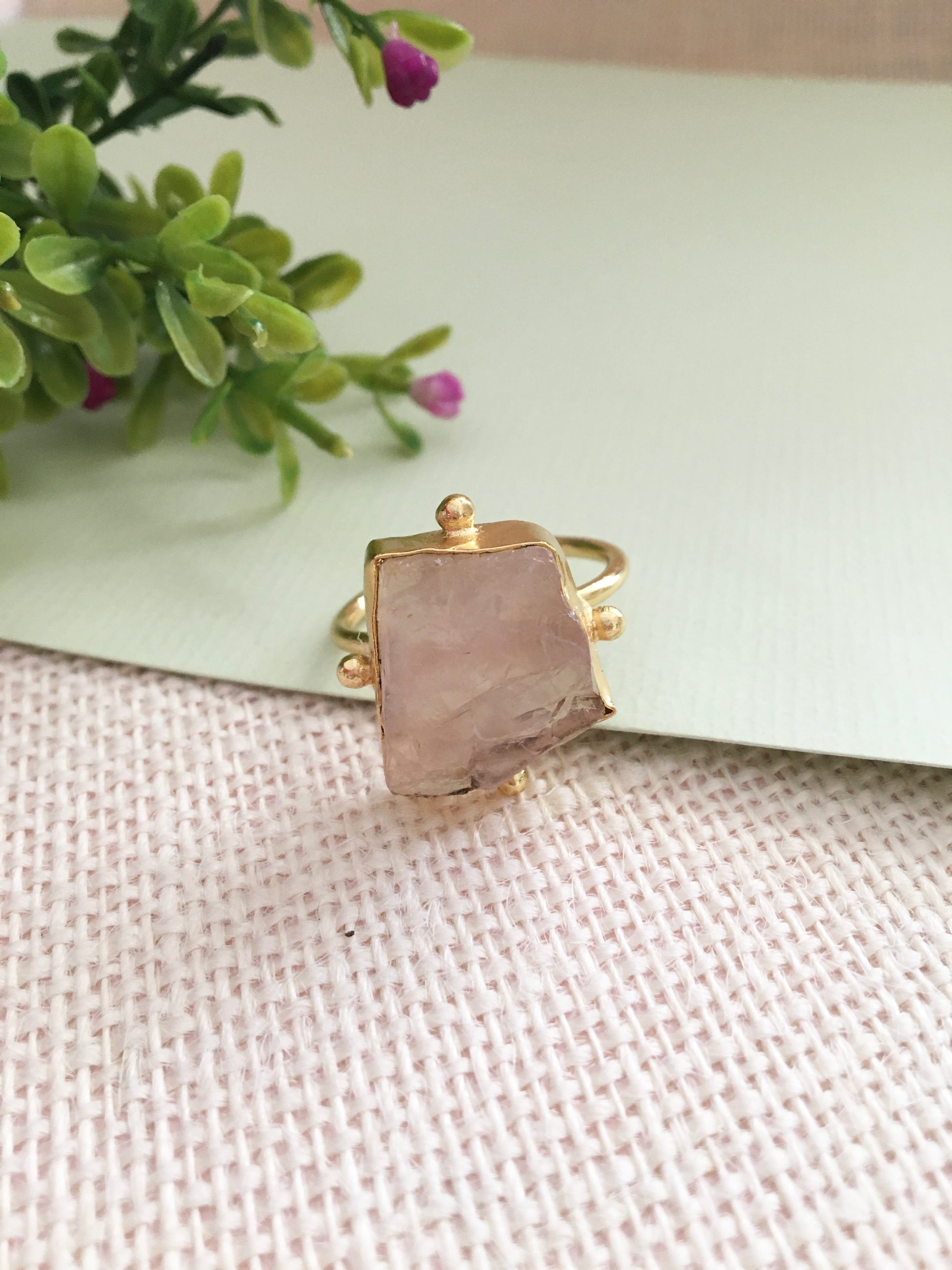 This collection offers a variety of stones with rich, earthy colors—including a deep purple amethyst, a soft, translucent rose quartz, a serene blue-green Amazonite, and a vibrant red-orange agate. The minimalist design of the ring band allows the raw beauty of the stone to take center stage, making these rings a perfect choice for those who love natural materials and modern style. Wear one on its own for a subtle statement or stack them to create a bolder look.