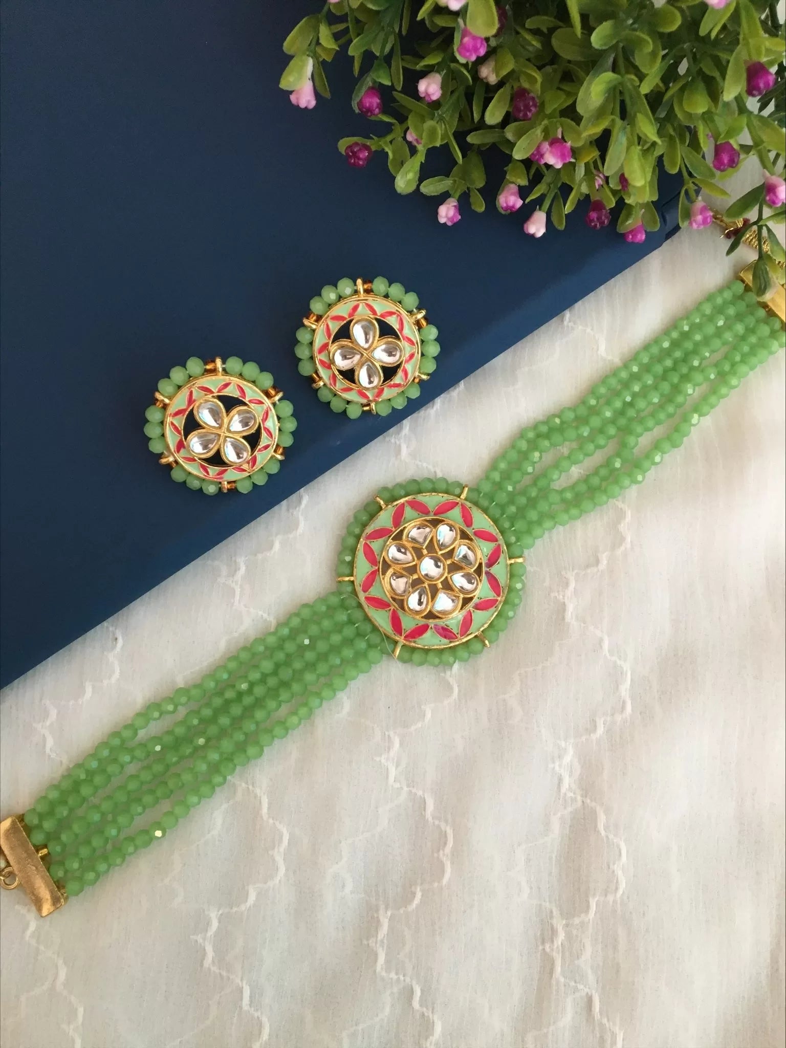 This choker set is a new pattern of chain well aligned with white beads. It provides full coverage and will add up elegance to your look. You can wear it with any ethnic, Indo-western or western outfit. Just add this pair to your attire and you will have an amazing look. Include this in your jewellery and glam up your special days.
