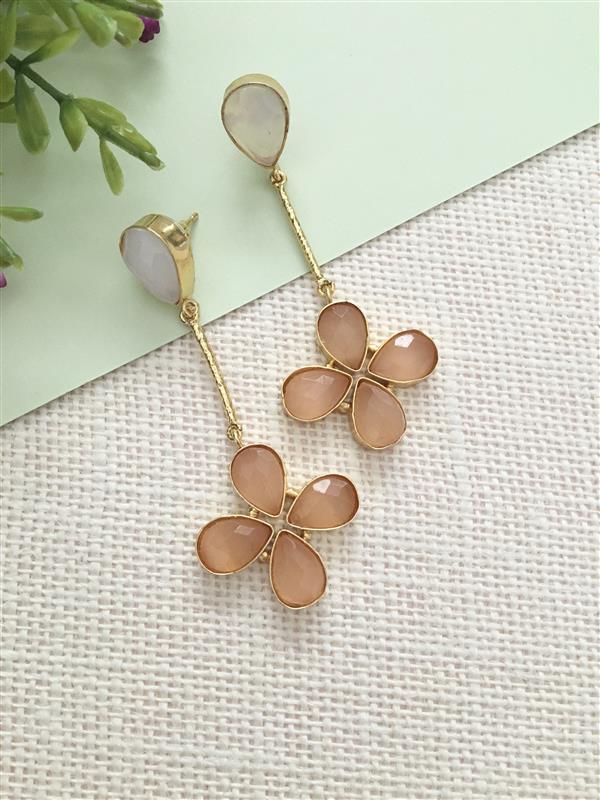 Add a touch of floral elegance to your collection with these beautiful Pastel Flower Drop Earrings. Each earring features a delicate white oval stone stud, from which a slender gold-toned bar gracefully descends. The bar connects to a lovely flower-shaped pendant crafted from four translucent, peachy-pink stones.