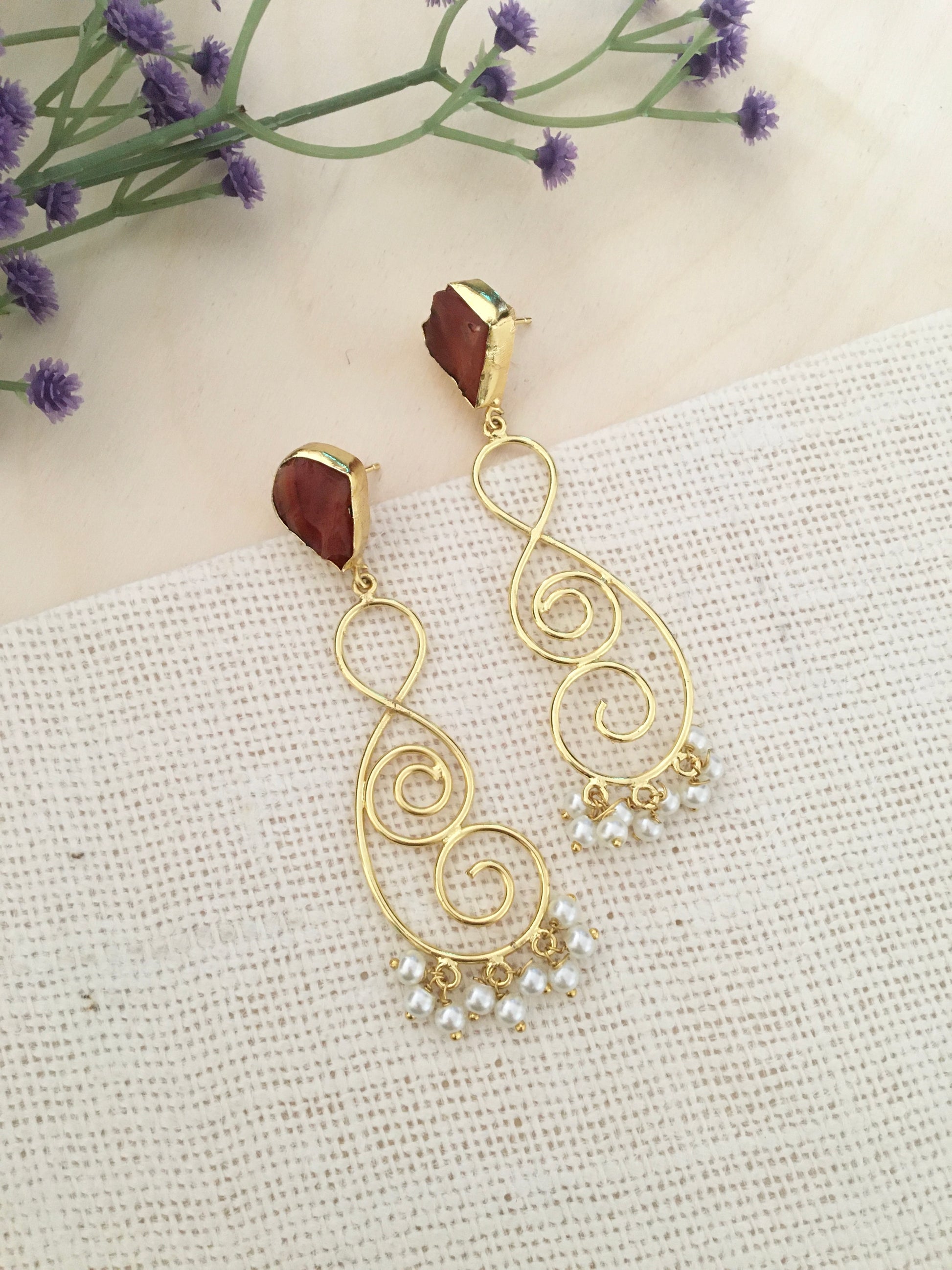 These elegant gold swirl dangle earrings bring together artistic curves and delicate pearl accents for a timeless and graceful look. The handcrafted design features a rich stone stud top and flowing wirework that ends in tiny pearl drops, making them perfect for festive wear, parties, weddings, or elegant everyday styling.