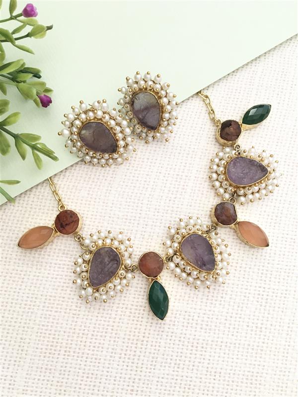 This exquisite jewelry set combines the raw beauty of amethyst polki stones with the timeless elegance of pearls. The necklace features a series of intricately set stones and delicate leaf-shaped accents, creating a graceful, flowing design. The matching earrings mirror the intricate pearl work, framing a stunning central polki stone. This set is a perfect blend of modern sophistication and classic charm, ideal for adding a touch of glamour to any special occasion.