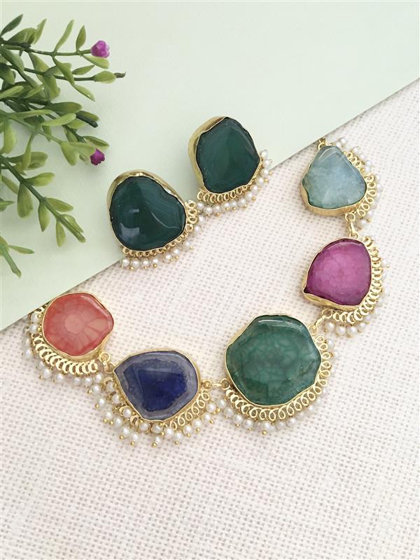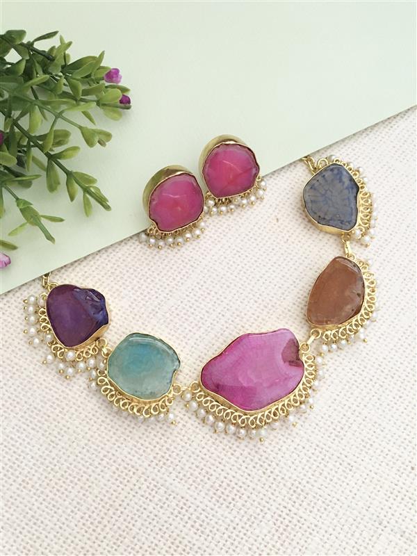 This stunning jewelry set brings together traditional craftsmanship and vibrant, modern design. The necklace features a series of uncut polki stones in various rich colors, each framed by a delicate border of white pearls. The matching earrings are designed to complement the choker perfectly, creating a cohesive and eye-catching look. This piece is perfect for adding a pop of color to your formal attire or for celebrating special occasions with a touch of unique elegance.