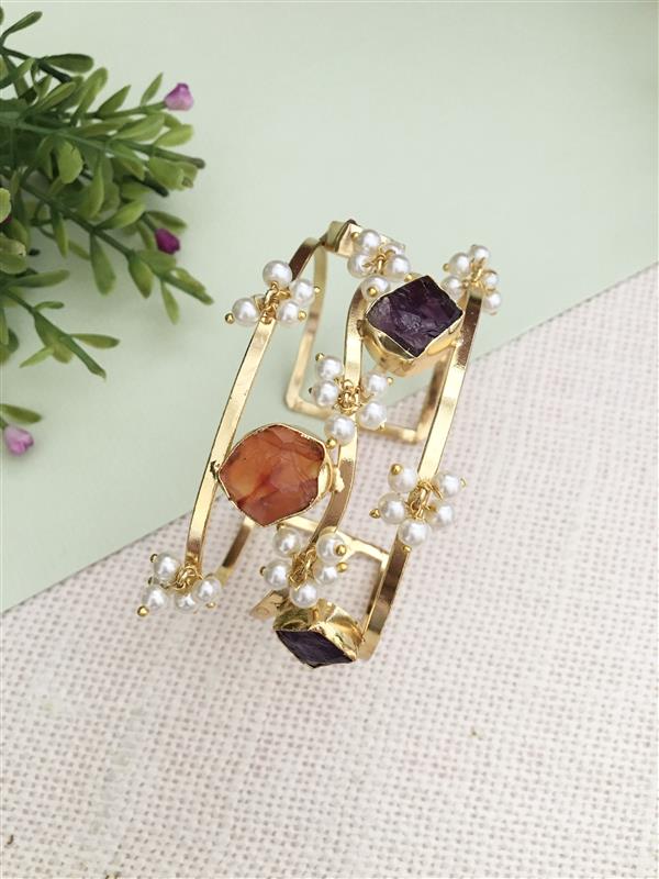 This elegant cuff bracelet combines the classic beauty of pearls with the rustic charm of uncut polki stones. The gold-toned band features a unique, modern design that is both stylish and versatile. Dainty pearl clusters are delicately wired to the frame, adding a touch of traditional grace. This piece is perfect for both everyday wear and special occasions, effortlessly blending contemporary and timeless aesthetics.