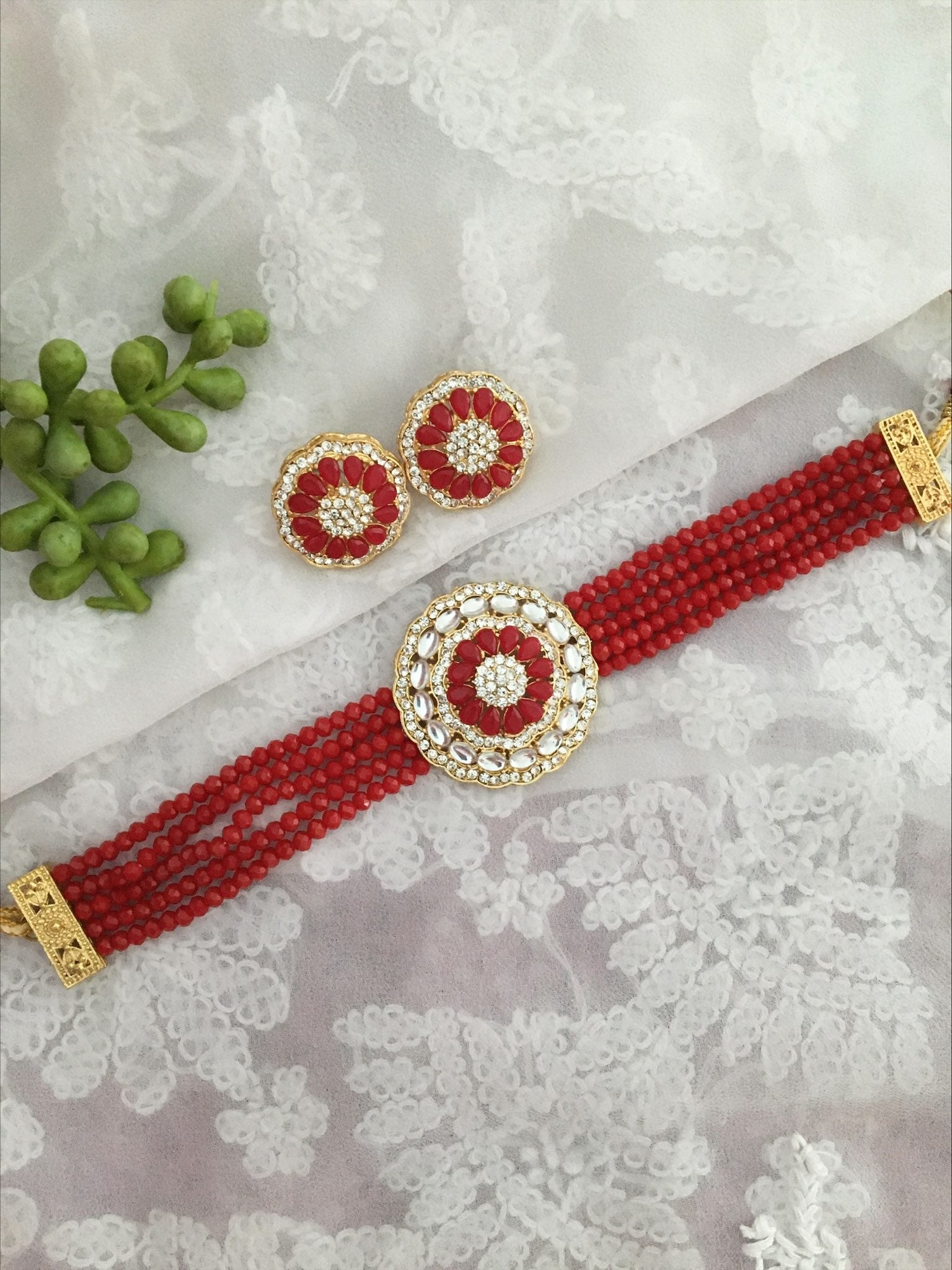 This jewellery set consists of a choker necklace and a pair of earrings a Red Kundan Necklace, secured with a drawstring closure A pair of matching oversized Stu Earring.