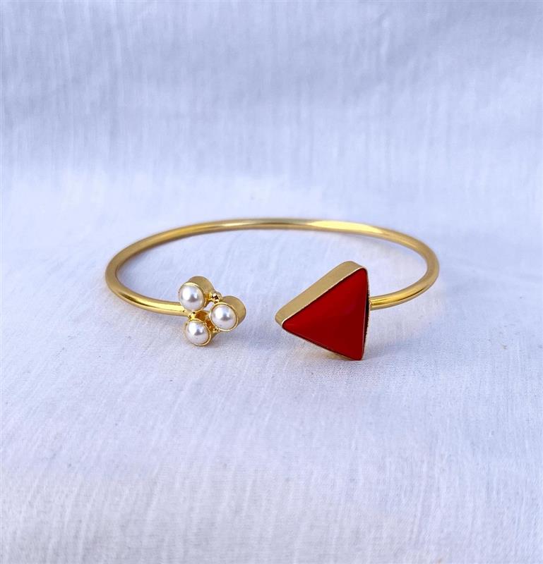 For a more classic and modern approach, our Triangle Stone & Pearl Bracelet is a must-have. The slender gold-toned cuff features a striking red triangular stone on one end and a cluster of lustrous faux pearls on the other. This unique, open design creates a bold yet elegant statement, making it a perfect accessory for any occasion.